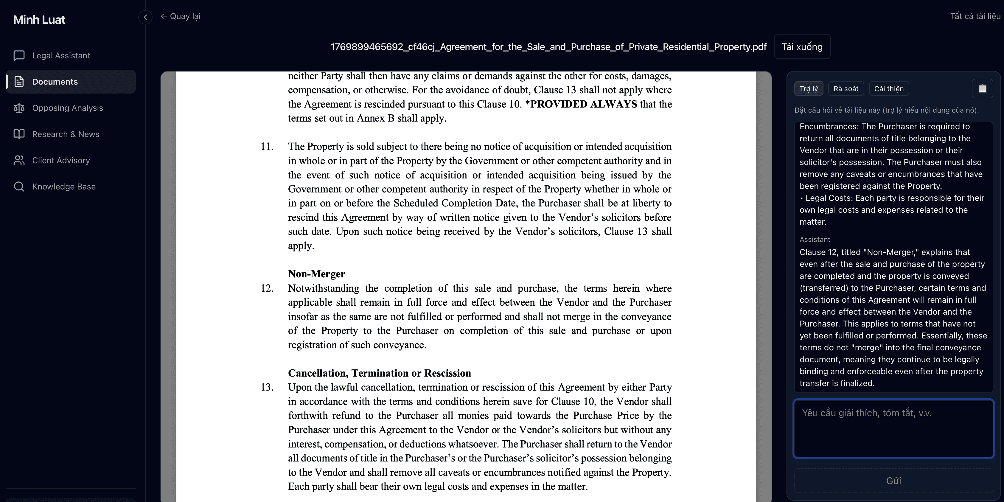 Upload a contract, agreement, legal decision or court filing — and get every question answered instantly. Minh Luat's technology reviews, improves and explains any document you have, so you always know what’s inside, what it means, and what to do next.